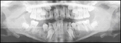 Orthopantomographie (OPG), Orthopantomogramm, Panoramaschichtaufnahme oder Rundumaufnahme aller Zähne (hier sieht man die Nichtanlage von unteren zweiten Prämolaren)